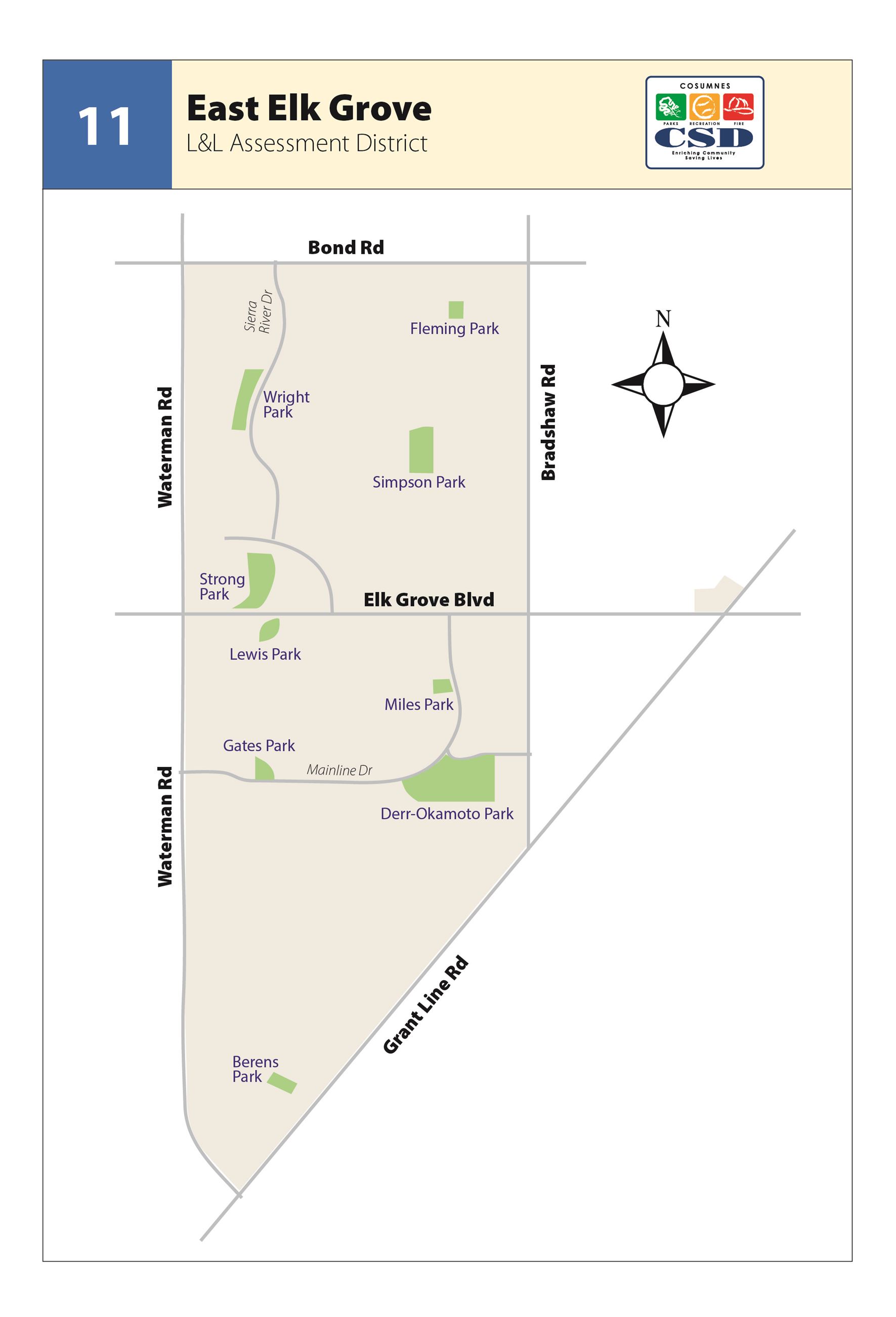 Benefit Zone 11 - East Elk Grove, benefits from nine parks totaling 41 acres. East Elk Grove continues to build out with future plans for Wright Park Phase II, Derr-Okamoto Park Phase II. Many parks are linked by either off-street trails or on-street bike lanes.